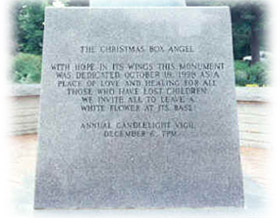 The Angel of Hope, an exact replica of the Christmas Box Angel statue, located in Salt Lake City, Utah, stands as a symbol of hope for all parents who have experienced the death of a child.